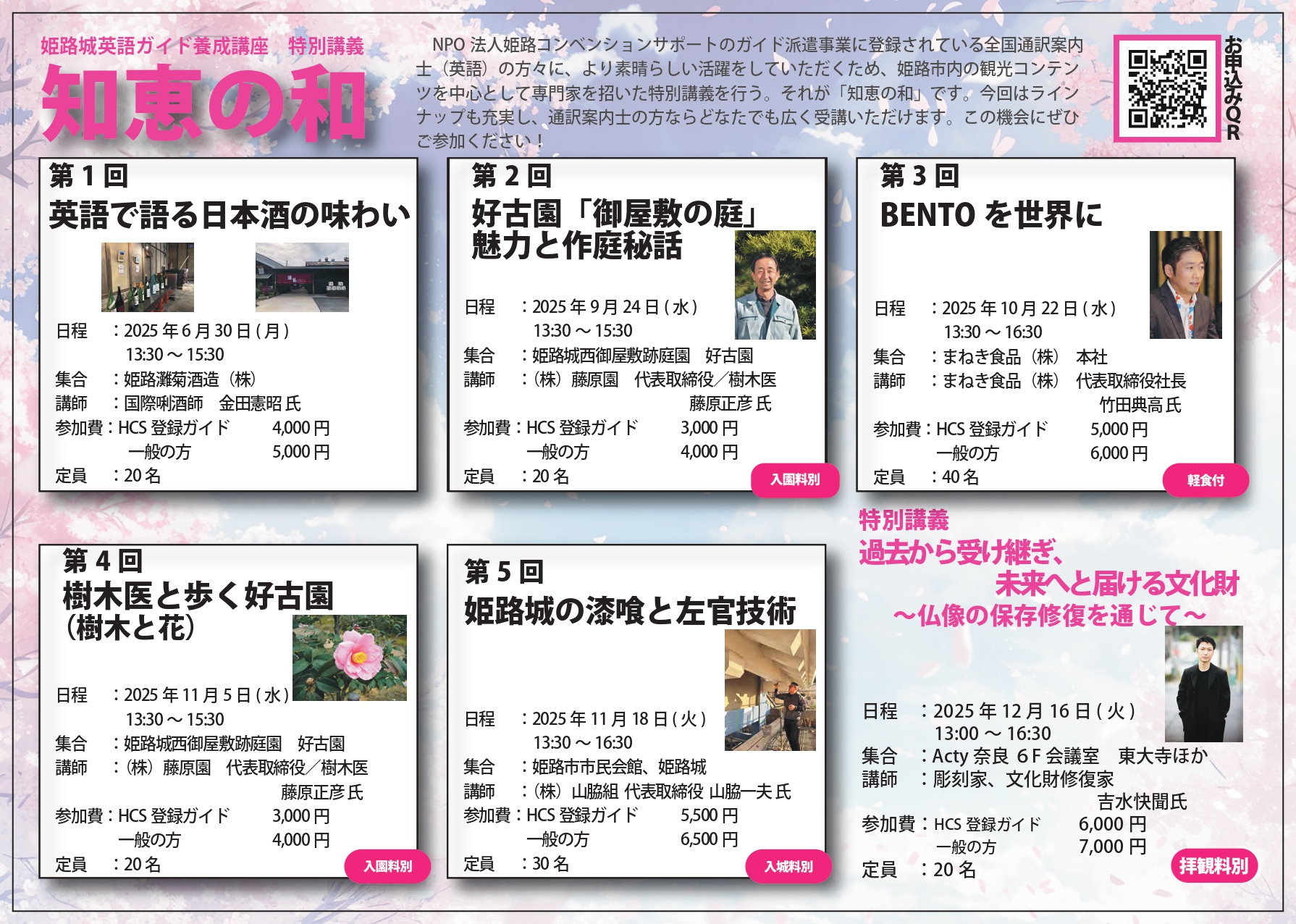 今年度は、弊社の契約ガイドや修了生だけではなく、全国通訳案内士の有資格者の方々も参加可能とすることで、姫路の魅力を多くの方々に知っていただき、そして皆様にその魅力を発信していただきたいと考え、全6回の講座を開催します。