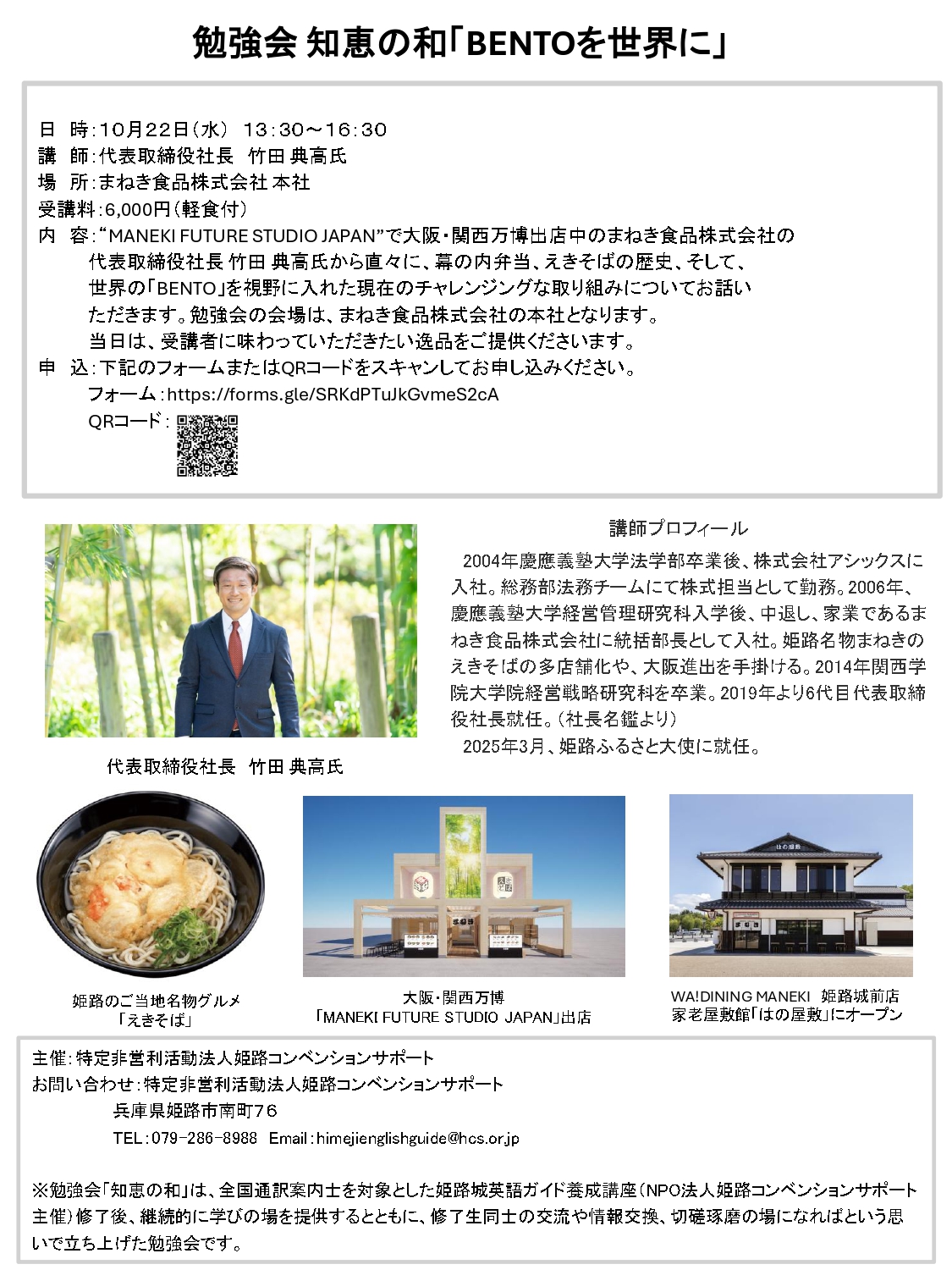 勉強会では、姫路を代表する食のパイオニアである、まねき食品の代表取締役社長 竹田 典高氏から貴重なお話をお伺いいたします。姫路に来られた海外のお客様にも、「えきそば」や「幕の内弁当」の魅力を伝えていきたいですね。ぜひ、この機会にお申し込みくださいませ。当日は、受講者に味わっていただきたい逸品をご提供くださいます。