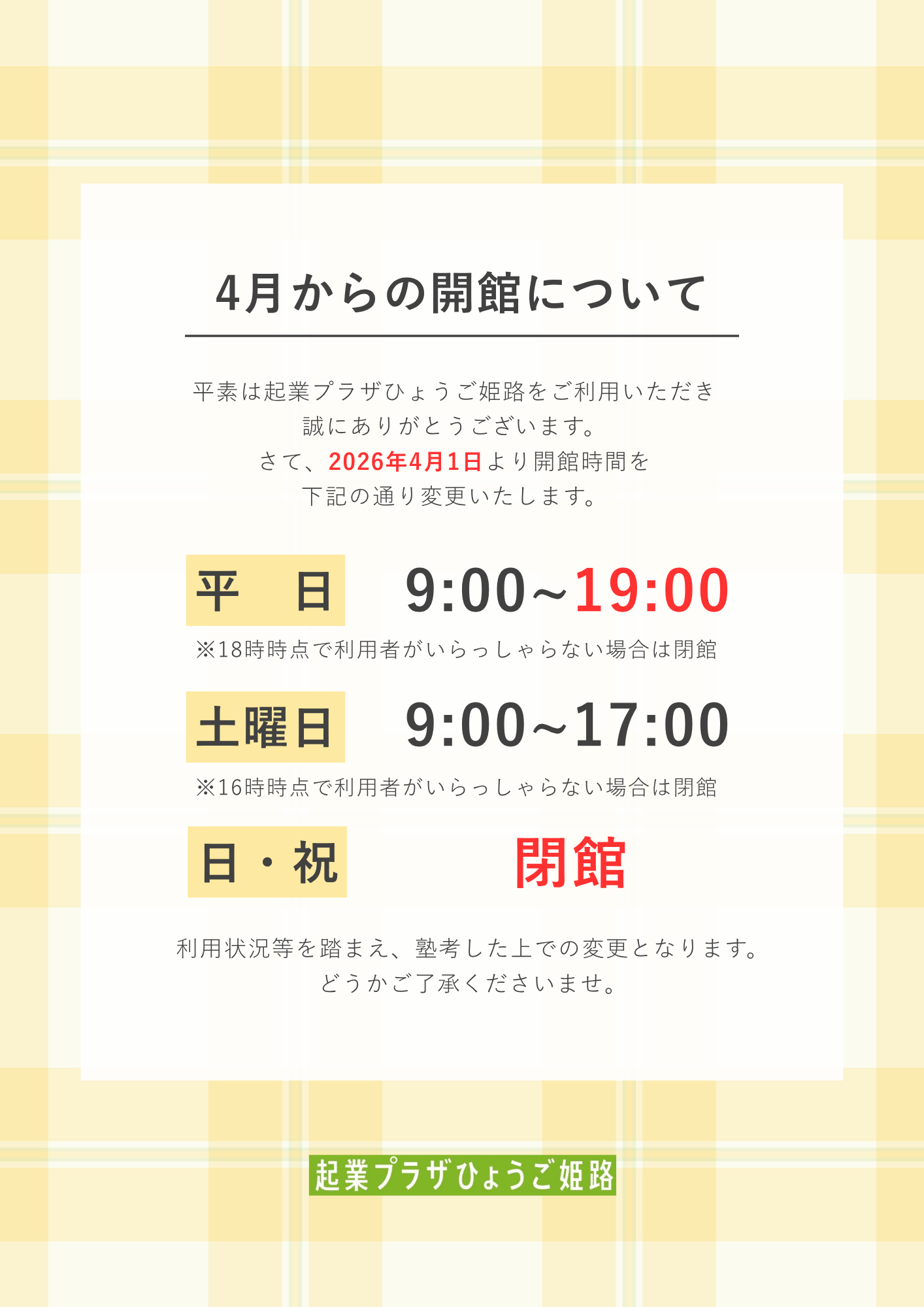 起業プラザひょうご姫路の開館時間変更について